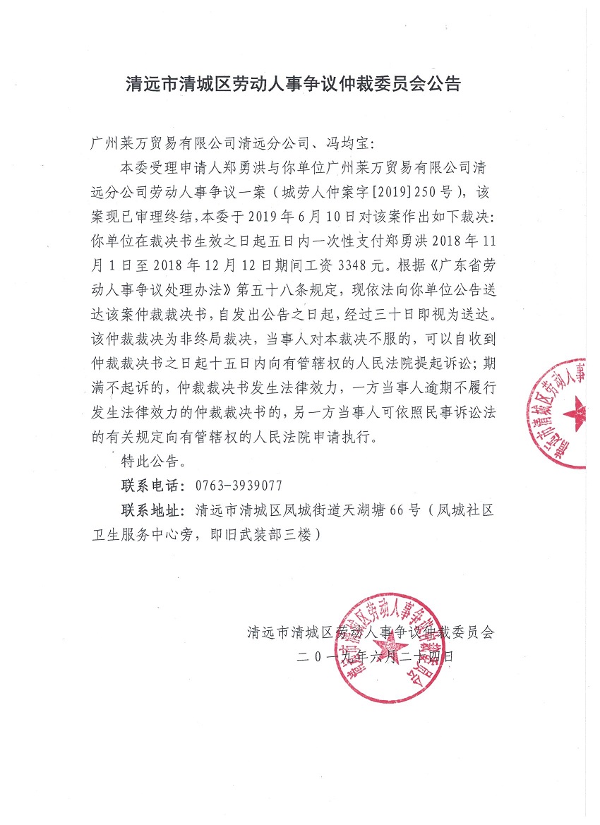 清远市传祺劳动人事争议仲裁委员会公告(广州莱万贸易有限公司清远分公司)