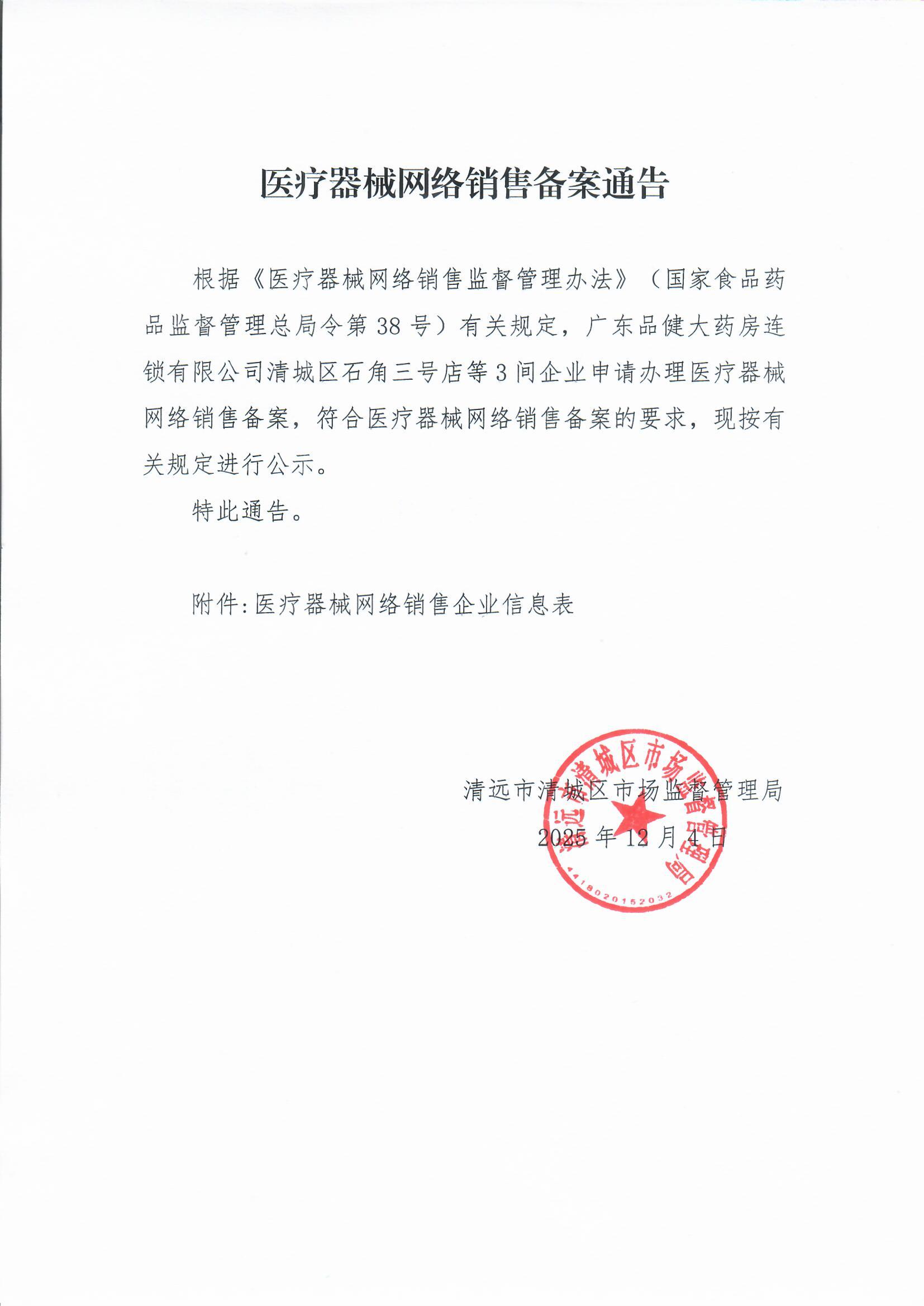 2 | 首次备案 | (清城)网械销售备字 ﹝2025﹞第48号 | 2025/12/1 | 广东品健大药房连锁有限公司清城区石角三号店 | 入驻类 | 91441802MADE68W87E | 清远市清城区石角镇福源街一幢第三号、东十二幢188号 | ****** | 抖店、抖音电商;京东到家;饿了么;美团网;拼多多商城;天猫 | (沪)网械平台备字[2022]第 00002 号;(沪)网械平台备字[2018]第 00002 号;(沪)网械平台备字[2018]第 00004 号;(京)网械平台备字(2018)第 00004 号;(沪)网械平台备字[2018]第 00003 号;(浙)网械平台备字[2018]第 00002 号 | 无 | 无 | 无 | 无 | 无 | 无 |