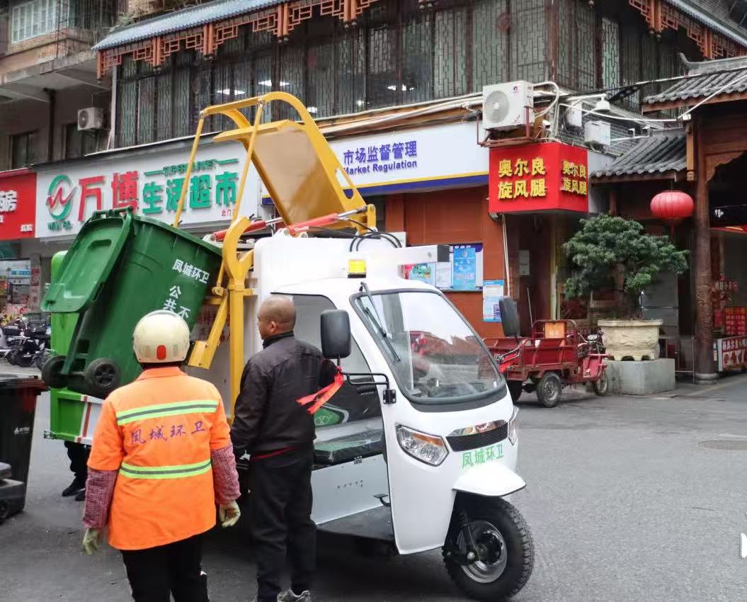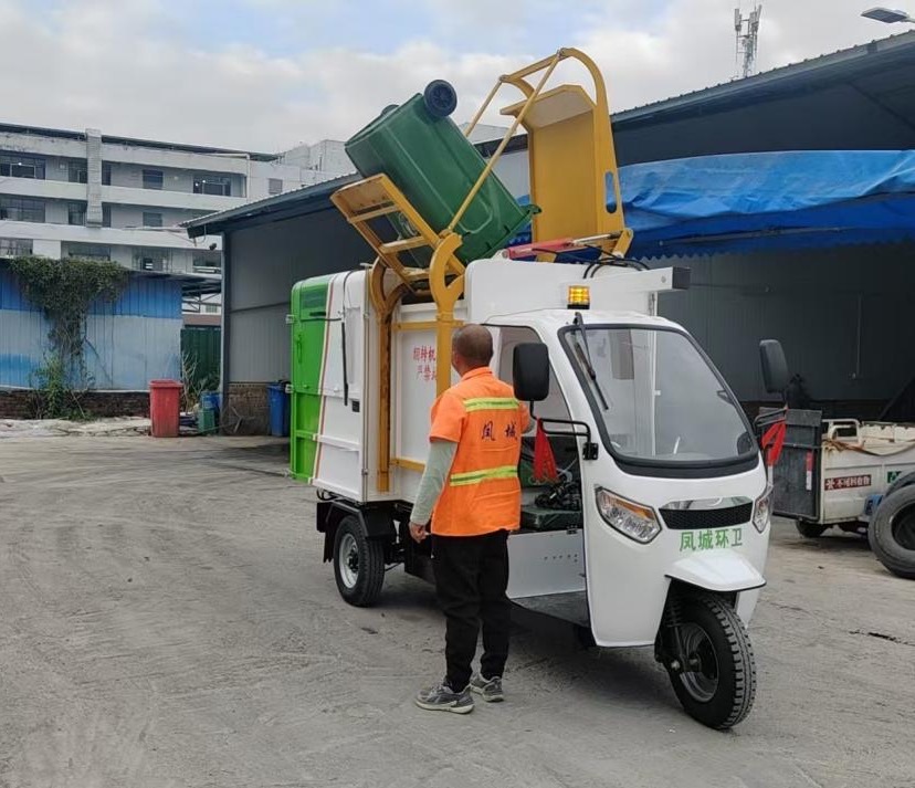 凤城环卫工人操作三轮电动压缩车进行垃圾收运工作