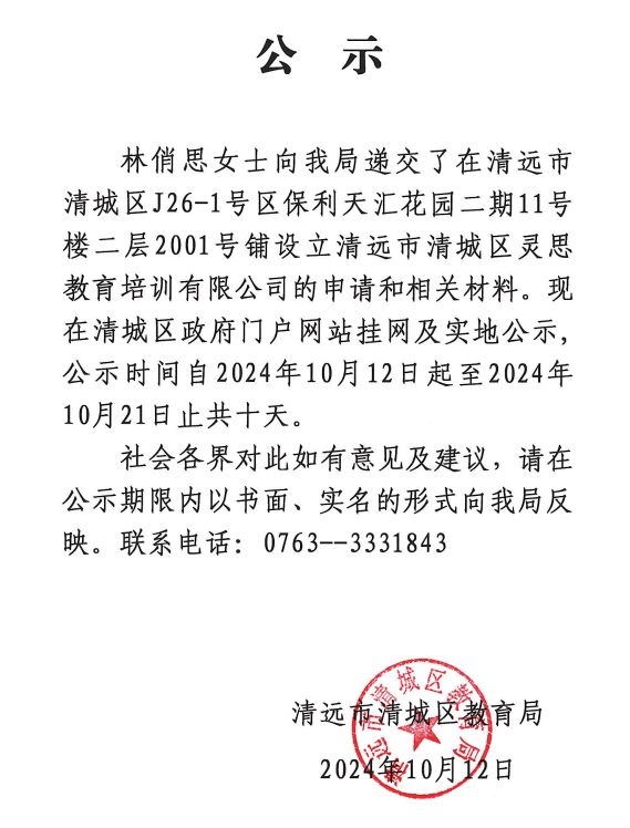 关于林俏思女士申请设立清远市清城区灵思教育培训有限公司的公示