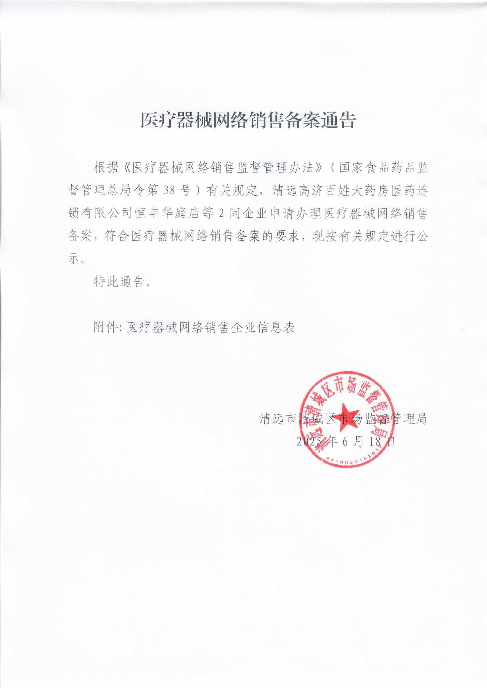 | 注销备案 | (清城)网械销售备字 ﹝2024﹞第073号 | 2025/6/6 | 清远高济百姓大药房医药连锁有限公司恒丰华庭店 | 入驻类 | 91441802MA531DBW1F | 清远市清城城北三路五号恒丰华庭九号楼商铺首层03号 | ****** | 饿了么;京东到家;高济药急送;美团网;抖店、抖音电商 | (沪)网械平台备字(2018)第00004号;(沪)网械平台备字(2018)第00002号;(京)网械平台备字(2020)第00010号;(京)网械平台备字(2018)第00004号;(沪)网械平台备字[2022]第00002号 | 无 | 无 | 无 | 无 | 无 | ||