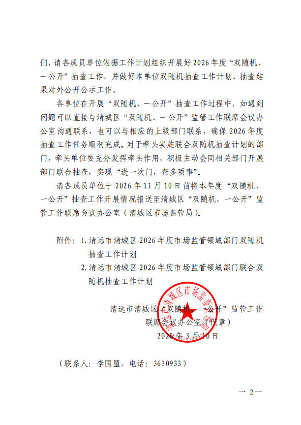 | 名称: | 清远市清城区“双随机、一公开”监管工作联席会议办公室关于印发《清远市清城区2026年度市场监管领域部门双随机抽查工作计划》《清远市清城区2026年度市场监管领域部门联合双随机抽查工作计划》的通知 | ||