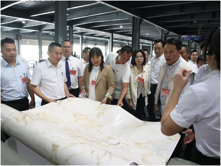 聚焦实体经济,关注经济社会高质量发展。在广东雄星新材料有限公司(以下简称雄星公司),代表一行现场听取了负责人关于雄星公司经营范围、年产量等基本情况介绍。在生产车间,代表们近距离查看了雄星公司产出产品,并现场查看了6.3万吨PVC压延膜扩建项目,听取了项目负责人关于项目建设进度的介绍,代表们表示,企业生产要统筹发展和安全,坚持人民至上、生命至上。