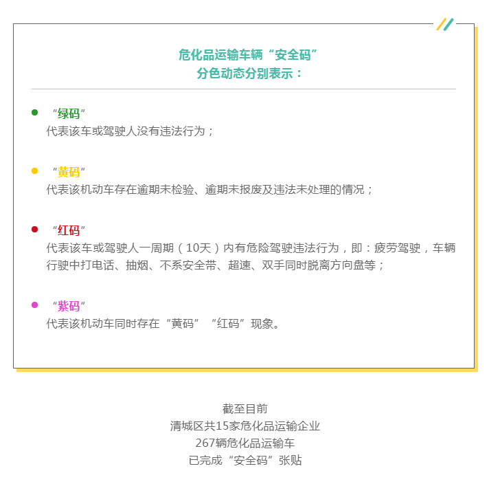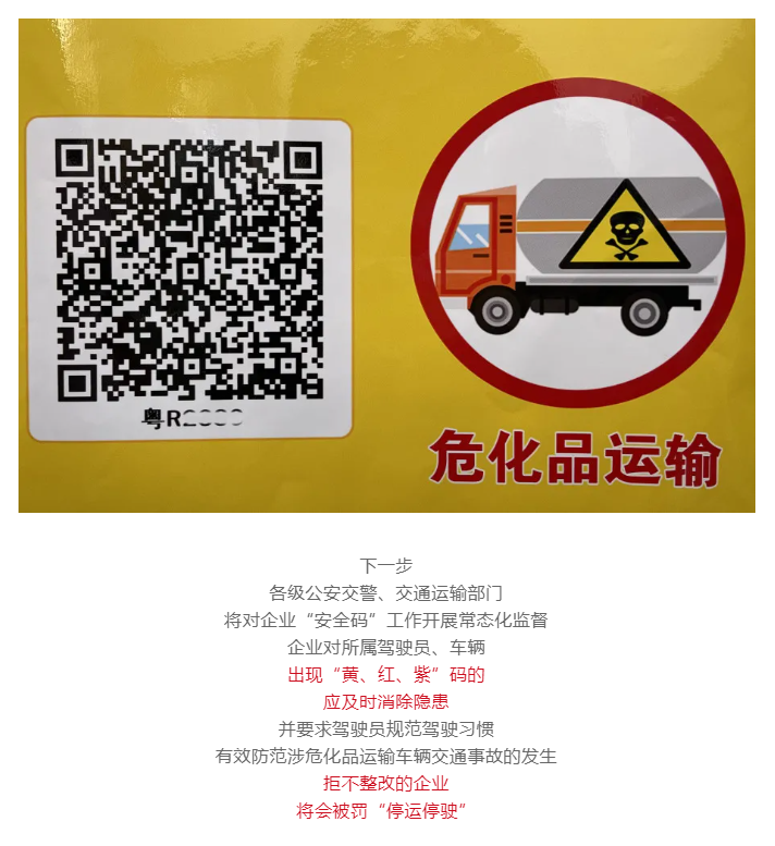 为压实危化品运输车辆交通安全风险防控,防范涉危化品运输车辆交通事故的发生,11月20日起,清远率先在全市范围内推出危化品运输车辆“四色码”管理新模式。通过张贴于危化品运输车辆驾驶席车门外侧的“安全码”,强化危化品运输车辆驾驶人户籍化、数字化监管,对危化品运输车驾驶人、安全行车情况实现精准管控。