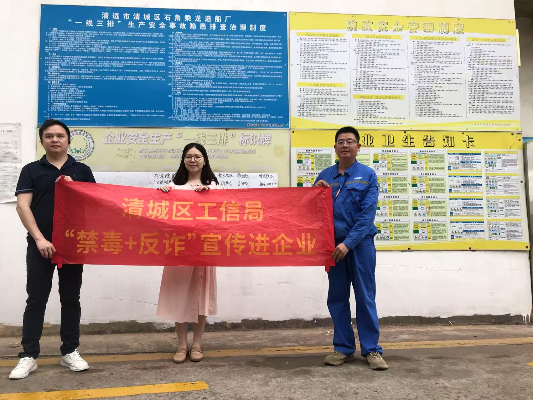 为落实清城区禁毒和反诈宣传工作,进一步增强企业的禁毒和反诈意识,营造良好的氛围,2025年4月,区工业和信息化局有关人员到清远市清城区石角乘龙造船厂、赢之城广场、华润万家超市开展禁毒和反诈宣传,工作人员向企业员工宣传禁毒和反诈知识,派发宣传小册子,让企业管理人员和员工了解毒品的危害性和反诈的重要性。