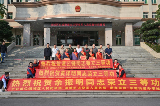 “矢志强军建功业,情系桑梓送荣光。”1月19日,清城区退役军人事务局联合区人民武装部,区司法局以及东城街道办事处为谭艺锋、余振明和黄泽明三位荣立三等功的现役军人家庭举行“东城街道2026年立功受奖军人家庭集体送喜报仪式”,共同送上承载荣誉的喜报与衷心祝贺。
