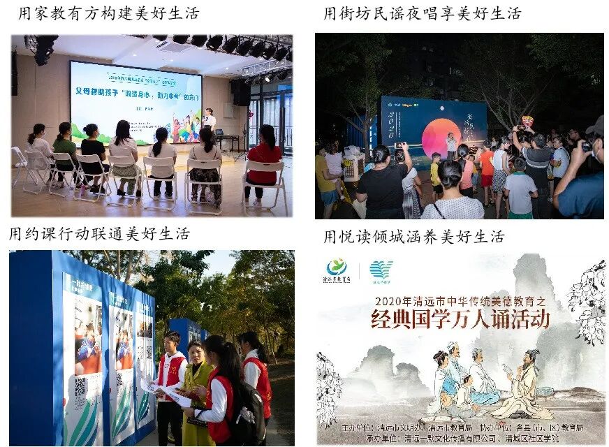 清城区社区学院目前已有1个中心(社区学院)、1个分中心(江心岛)、8个所、161个站,以及107个教育服务点及社区教育教学点7个。清城区社区学院围绕清远创建全国文明城市、新时代文明实践中心建设工作,对应推动“暑期未成年人活动进社区”“乡村学校少年宫”“我为文明代言”等活动,并在社区课程、活动开展过程中,加强文明实践志愿服务工作开展,加强创文相关宣传。2020年,清远市关工委、清远市妇联联合省家庭教育研究会以清城为试点,共同打造“清远市家庭教育示范基地”,并选取清城区社区学院作为“广东省家庭教育研究实践基地”。凤城街办充分利用旧城现有历史文化资源,以南门街历史文化为基础,开展南门街升级改造项目,对沿江路文化广场、南门文化特色街进行升级改造,打造城市特色旅游休闲目的地。凤城沿江路文化广场升级改造项目对原南门口牌坊进行复原改良,重新打造新南门口牌坊这一旧城标志性建筑。公园增设休闲台椅、健身器材、儿童娱乐设施及公厕。改造南门街南段主街及横巷内街两边的骑楼地面、天花、墙面、广告招牌等设施。