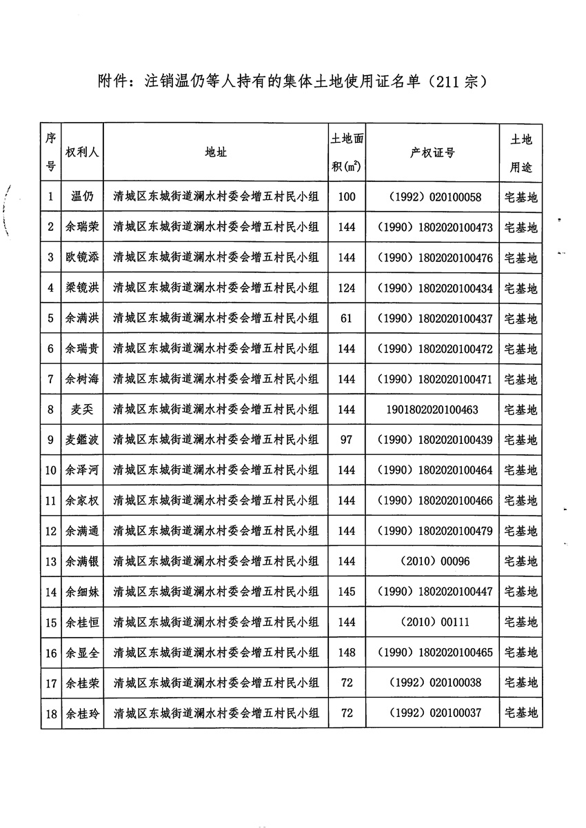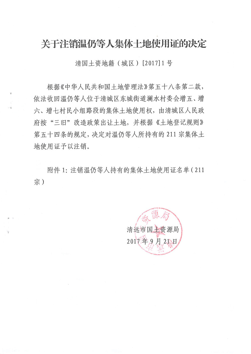关于注销温仍等人集体土地使用证的决定
