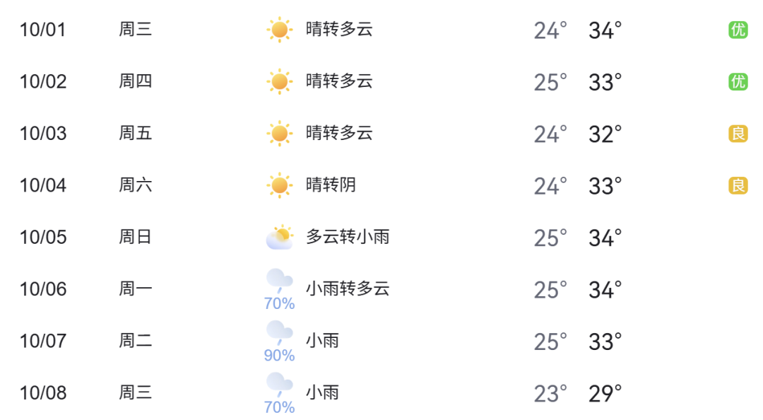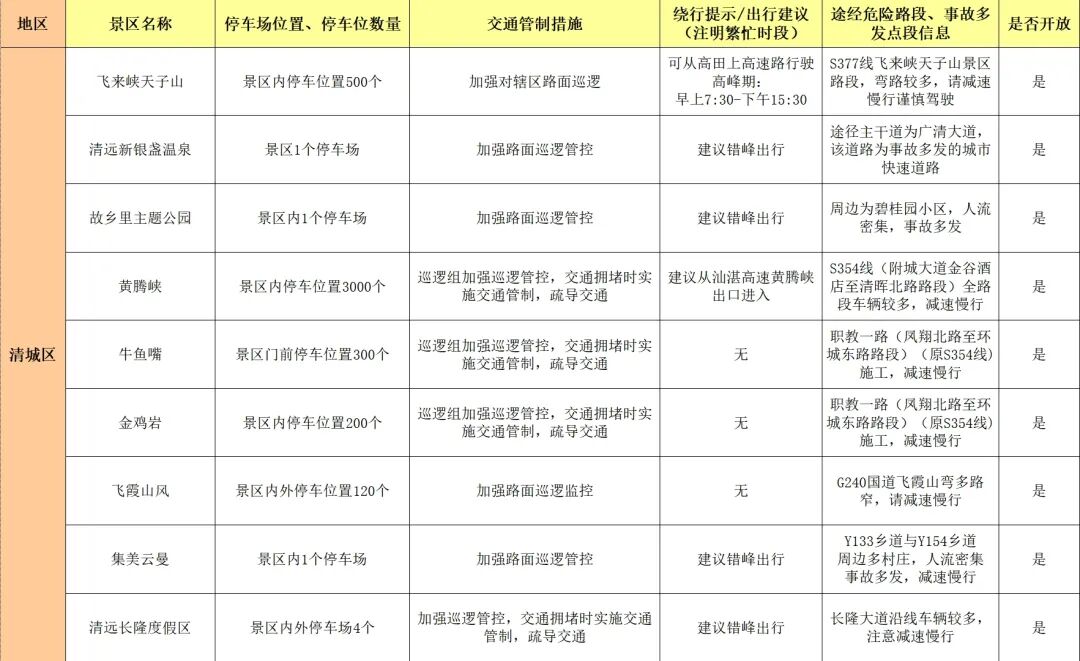 ●放假时间 国庆中秋假期:10月1日至8日放假调休,共8天。9月28日(周日)、10月11日(周六)上班。 ●相关政策 根据《重大节假日免收小型客车通行费实施方案》安排,高速免费通行时间为10月1日0时—10月8日24时,7座(含)以下小型客车免费通行! ●天气情况 根据气象部门预测,清城区国庆中秋期间,天气以晴、多云和小雨为主,出行要时刻留意实时天气情况,合理安排出行路线。 【温馨提示】 天气情况瞬息万变,请以最新预报为准! 清城区路况 易堵路段 ●附城大道金谷酒店至清晖北路路段 ●G240国道中国银行广东省分行研修院路段 ●Y133乡道往Y154乡道集美云曼路段 ●广清大道转银英公路方向路段 ●长隆大道清远长隆度假区路段 ●先锋路路段 ●湖西路路段 ●环城三路与飞水大桥T型路口 ●防汛路石角镇大堤路段 ●清远西花坛高速出口至清远大桥(江南北路)路段 ●红树林-顺盈广场路段 事故多发路段 ●职教一路(凤翔北路至环城东路路段) ●桥北路路段 ●清远大桥路段 ●城西大道路段 ●清远大道横荷花坛路段 施工路段 ●职教一路(凤翔北路至环城东路路段) 清城区景区情况 出行提示 1.自驾出行前,应提前检查车辆状态,及时关注天气情况,了解交通路况信息和交通安全提示,合理安排出行时间和交通方式,尽量避开出行高峰和夜间行车,拒绝疲劳驾驶。 2.驾车前往景区山区,遇急弯陡坡、长下坡、临水临崖道路,要减速慢行,行经农村、山区公路要注意观察道路两侧车辆和行人。景区周边道路车多拥挤,要注意避让行人、规范停车。 3.安全带是生命带!使用安全带可以将交通事故伤亡风险降低40%以上。驾乘汽车出行,请系好安全带。驾车带儿童出行时,请为儿童选用适合其年龄、体重的儿童安全座椅。 4.疲劳驾驶会导致判断力下降、反应迟钝,加大操作失误风险。长途驾驶,请合理安排好行车计划和休息时间,确保睡眠充分,连续驾驶机动车超过4小时需停车休息至少20分钟。 5.中秋国庆假期,亲朋聚会增多,酒后驾驶安全风险加大。酒精会导致人的视线模糊、判断失准、运动机能下降、反应迟钝。酒后驾驶害人害己,请您酒后莫开车,开车莫饮酒。