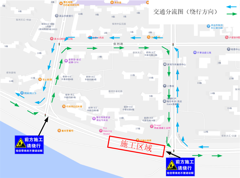 1.封闭路段:清城区沿江中路保利中景花园南门路口路段(从沿江中路与学文路交叉口开始,往西150米),双向道路全封闭。